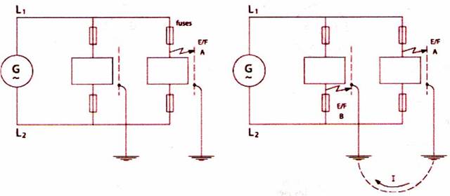 An earth fault ‘A’ occurring on one line of an ‘INSULATED