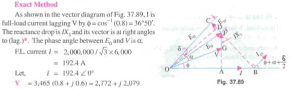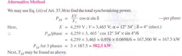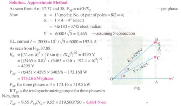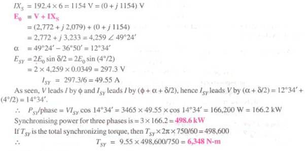 A 2000 KVA, 3 phase, 8 pole alternator runs at 750 r.p.m. in parallel with other machine on 6000 V bus bars. Find synchronizing power on full load 0.8 p.f. lagging per mechanical degree of displacement and the corresponding synchronising torque. The synchronous reactance is 6 ohm per phase.