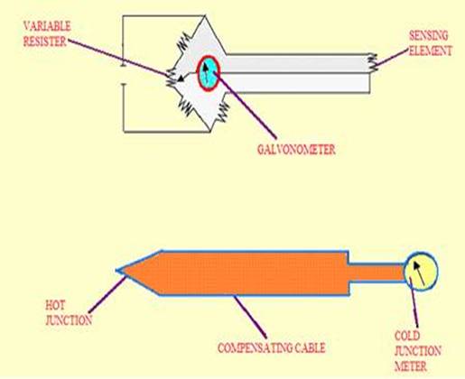 resistance of a metal varies with temperature . The sketch shows resistance thermometer, utilising the wheatstone bridge principal.