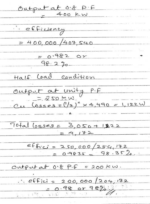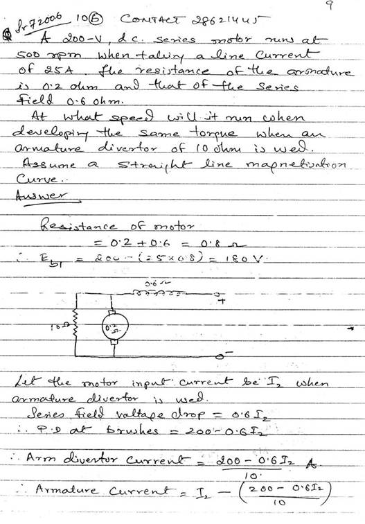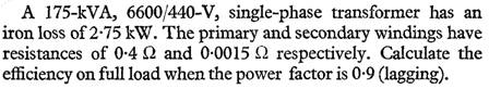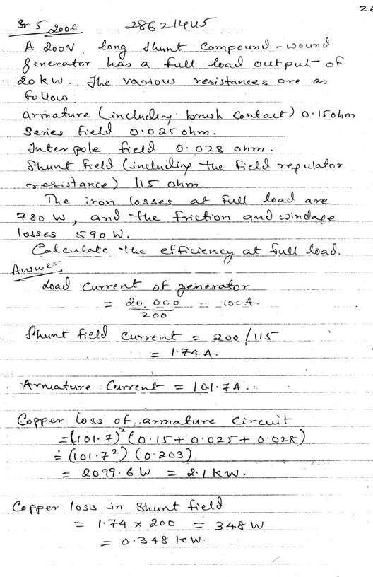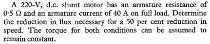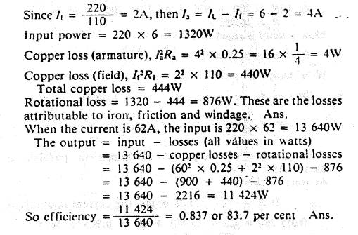 The armature and field resistances of a 220V shunt motor are 0.25 and 110 ohms respectively and, when running on no load, the motor takes 6A. Calculate the losses attributable to iron, friction and windage and, assuming this value to remain constant on all loads, determine the efficiency when the current supplied is 62A.