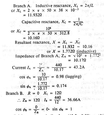 parallel circuit consists of a branch A of resistance 10Q, inductance 38mH and