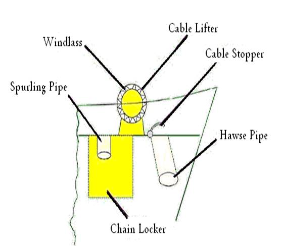 ships anchorage system; hawse pipe, cable stopper, windlass and cable lifter, spurling pipe and chain locker.