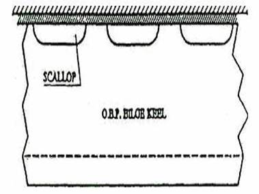 plate (OBP) with scallops cut in it is welded to the flat bar doubler. The ends of the bilge keels are tapered and if the