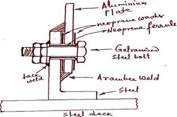 The contact between the two metals is prevented by using neoprene washers and neoprene ferrule. Galvanised steel bolts are used and the nuts are fitted in the inside of the house and tack welded to boundary angle to allow the joint to be tightened without removal of the internal linings. The top and bottom of the joints are specially welded with a compound known as arambee to form a watertight seal.
